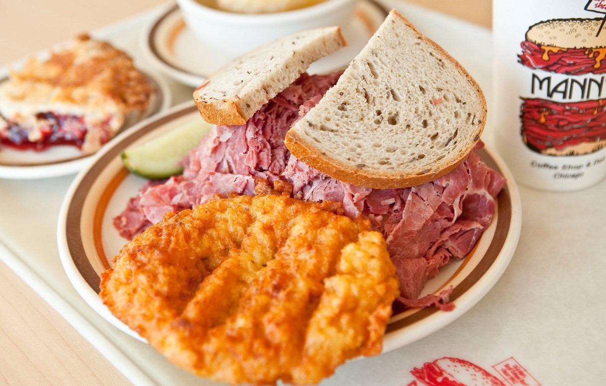 전형적인 시카고 아침 식사 메뉴인 아침 샌드위치로 하루를 시작하세요. 1942년부터 맛있는 음식을 제공해 온 가족 소유의 델리인 Manny's Deli로 가보세요. 아침 샌드위치에는 스크램블드 에그, 베이컨, 아메리칸 치즈가 포함되어 있으며 원하는 빵에 모두 $5.99에 제공됩니다.