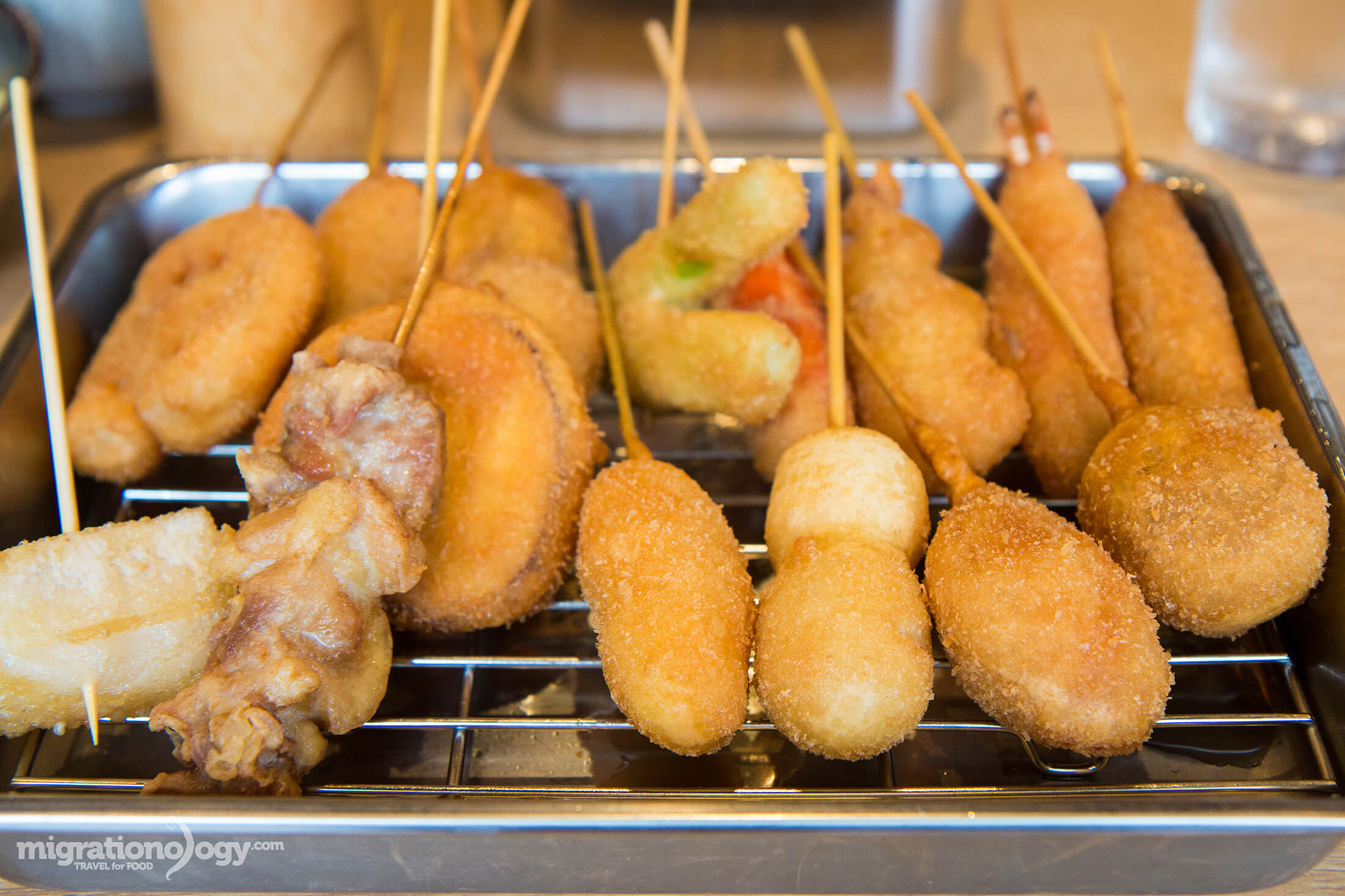 쿠시카츠는 오사카에서 인기 있는 꼬치 튀김입니다. 고기와 해산물부터 야채와 치즈에 이르기까지 다양한 재료를 꼬치에 꽂고 반죽한 것을 볼 수 있습니다. 꼬치는 일반적으로 달콤하고 짭짤한 소스와 함께 제공되며 맛있는 간식 또는 애피타이저입니다.