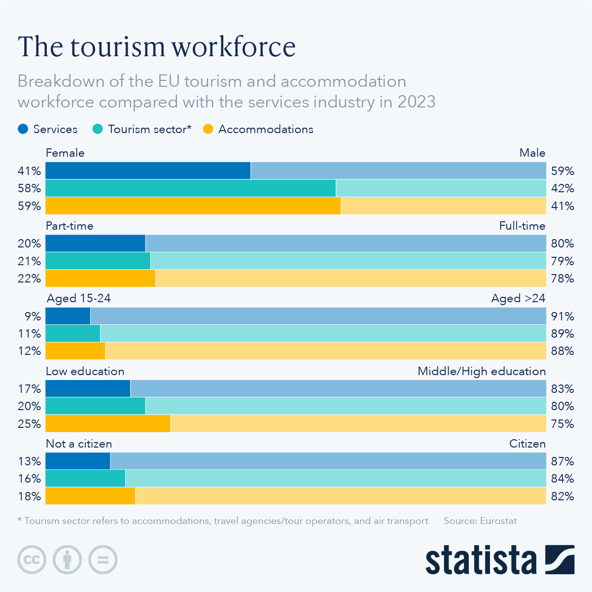 EU 27개국의 2023년 관광·숙박업 노동력을 서비스업과 비교 분석한 결과, 놀랍게도 여성 비율(관광 58%·숙박 59%)이 높고, 15~24세 청년층 취업 비율도 다른 산업에 비해 크게 앞섰습니다. 반면 숙박업 비시민 고용 비중도 18%로 여전한데요. 단기·비정규직 비율, 학력별·국적별 차이까지 한눈에 살펴보세요.