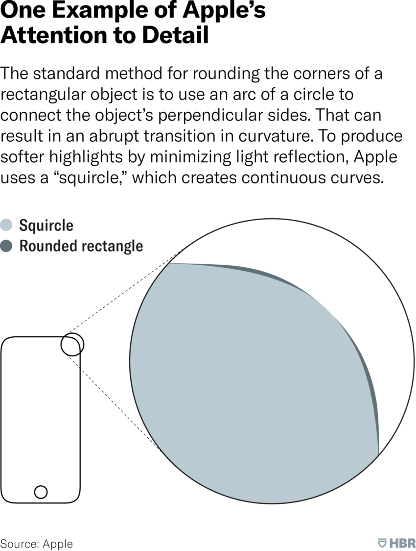 Of course, the leaders of many companies insist that they and their teams are steeped in the details. But few organizations match Apple. Consider how its senior leaders pay extreme attention to the exact shape of products’ rounded corners. The standard method for rounding corners is to use an arc of a circle to connect the perpendicular sides of a rectangular object, which produces a somewhat abrupt transition from straight to curve. In contrast, Apple’s leaders insist on continuous curves, resulting in a shape known in the design community as a “squircle”: The slope starts sooner but is less abrupt. An advantage of hardware products without abrupt changes in curvature is that they produce softer highlights (that is, little to no jump in light reflection along the corner). The difference is subtle, and executing on it isn’t simply a matter of a more complicated mathematical formula. It demands that Apple’s operations leaders commit to extremely precise manufacturing tolerances to produce millions of iPhones and other products with squircles. This deep immersion in detail isn’t just a concern that is pushed down to lower-level people; it is central at the leadership level.