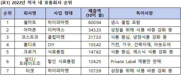 미국 시장에서 성공하기 위해서는 교포 시장과 메인스트림 시장으로의 구분이 중요합니다. 이 두 시장은 제품 자체가 달라야 한다는 점에서 차별화가 필요합니다. NRF(National Retail Federation)에 따르면, 2022년 미국 내 주요 유통회사들은 월마트, 아마존, 코스트코, 홈디포, 크로거, 알디, 타겟 순으로 순위가 매겨졌습니다.