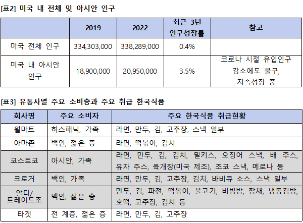 주요 유통사들은 식품 포트폴리오를 강화하는 전략을 채택하고 있으며, 특히 아시안 식품 중에서도 한국식품에 대한 관심이 점차 증가하고 있습니다. 라면, 만두, 김, 고추장 등은 이미 미국의 주류시장에서 인기 있는 식품으로 자리 잡았으며, 최근에는 김치도 주류시장에서 인기를 끌고 있습니다.