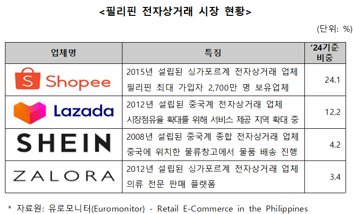 🛒 필리핀에서 가장 큰 온라인 쇼핑 플랫폼은 Shopee, 그 뒤를 Lazada, Shein 등이 뒤따르고 있습니다.
