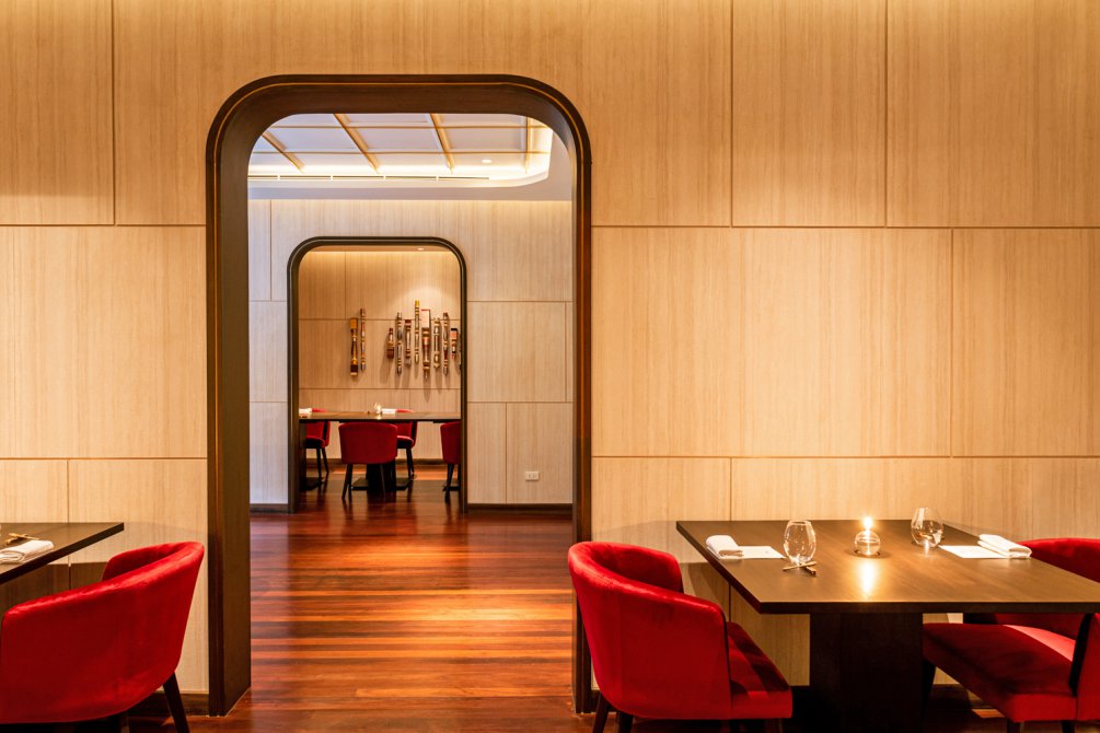 레스토랑의 분위기는 셸락 레드와 골드의 풍부한 색상으로 고급스러운 식사 경험을 더합니다. 은색과 금색 태국 실크는 태국의 예술적 장인정신을 강조하며 우아함을 더합니다. 2층에는 친밀한 저녁 식사나 특별한 축하 행사에 적합한 개인 식사 공간이 있습니다.