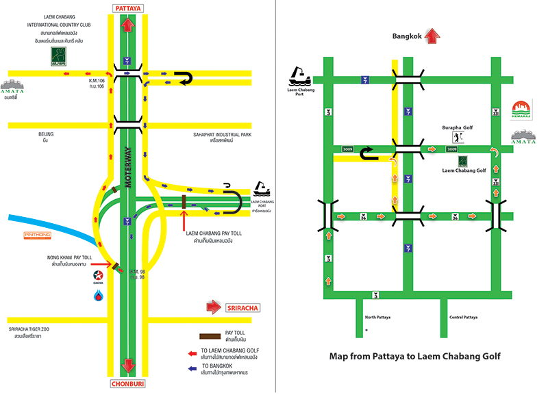 방콕-촌부리 모터웨이(루트 7)와 루트 36을 이용하면 쉽게 갈 수 있다. 아마타 씨티를 거쳐, 람차방 포트 입구를 지나 약 5km 지점에 골프장 입구가 보인다.