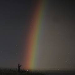 A man is taking a picture of a rainbow in the night sky.