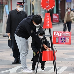 한 소년이 돈을 금속 냄비에 넣고 있다.